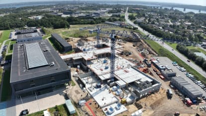Ligeledes i uge 33 blev det det sidste terrændæk støbt i den ene ende af bygningen, så nu er hele bygningens kældergulv støbt, som det kan ses på dronebilledet.