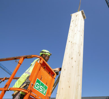 Før sommerferien begyndte træmontagen. De første søjler, som er en del af den bærende konstruktion, blev monteret. Senere i processen bliver de træsøjler monteret, som også bliver som et vigtigt element i kontorets færdige interiør.