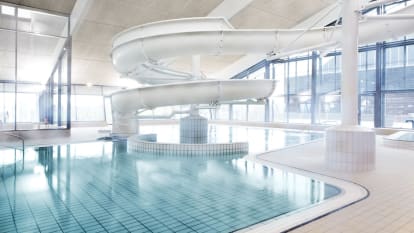 I forbindelse med eksisterende idrætsfaciliteter, ishockey-arena, idrætshaller mv. blev der opført en ny svømmehal med supplerende faciliteter som konference, wellness, foyer og café. Svømmehallens formsprog og overordnede greb hentede inspiration i motiver fra vandets verden. Svømmehallen skyder sig ud fra det eksisterende anlæg og rejser sig som en gigantisk dynamisk svungen bølge, der åbner sig op mod landskab, himmel, lys og luft. Tagfladen følger konturen af funktionerne under den og løfter sig over den nye indgang mod øst og anviser på elegant og dramatisk vis hovedankomsten.